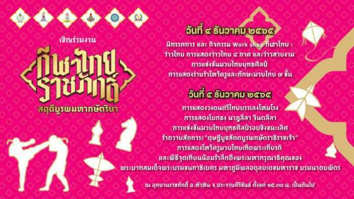 ภายในงานประกอบไปด้วย การโชว์ว่าวไทยสี่ภาค และว่าวสวยงาม อนุรักษ์สืบสานกีฬาไทย , การสาธิตกระบี่กระบอง , การสาธิตมวยโบราณสี่ภาค , การแข่งขันมวยไทยยุทธศิลป์รุ่นประชาชนทั่วไป ๓ ประเภท ได้แก่ ประเภทบุคคล , คู่เดี่ยวและประเภททีม ,การแสดงร่ายรำไหว้ครูและทักษะมวยไทย ๙ ขั้น และการแสดงไหว้ครูมวยไทยเทิดพระเกียรติ โดยคณะนักเรียนนายสิบทหารบก