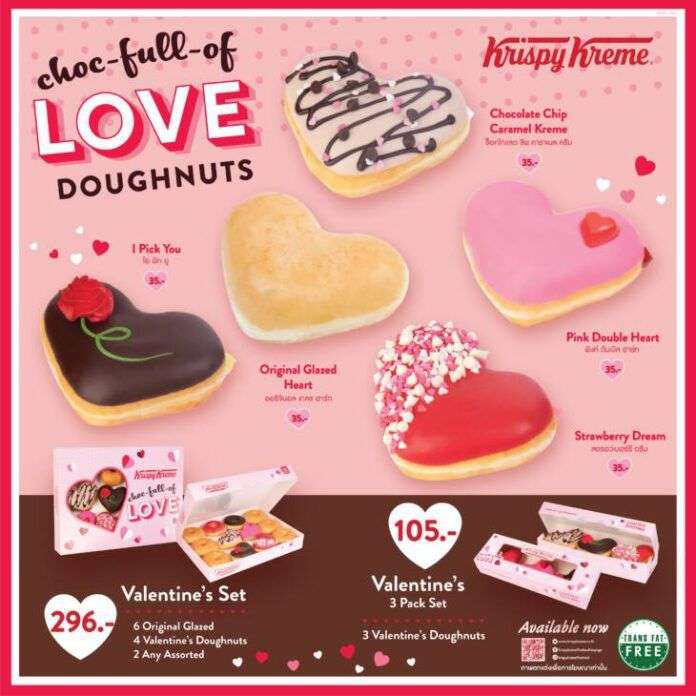 คริสปี้ ครีม (Krispy Kreme) โดนัทสูตรลิขสิทธิ์อันดับ 1 ที่ครองใจคนทั่วโลก พร้อมสร้างสีสันวันแห่งความรักให้ครบรสกับ “วาเลนไทน์ โดนัท” (Valentine’s Doughnut) ที่ยกขบวนโดนัทรูปหัวใจมาเป็นสื่อแทนความรู้สึก เริ่มที่ “ไอ พิก ยู” (I Pick You) อร่อยลงตัวกับดาร์กช็อกโกแลตและความหอมหวานของไส้คัสตาร์ด ตกแต่งด้วยกุหลาบแดงแทนรักสุดหัวใจ, “พิงค์ ดับเบิล ฮาร์ท” (Pink Double Heart) ให้ใจคูณสองด้วยโดนัทสีชมพูสดใสพร้อมไส้ฉ่ำๆ ของสตรอว์เบอร์รีหวานอมเปรี้ยว, “ช็อกโกแลต ชิพ คาราเมล ครีม” (Chocolate Chip Caramel Kreme) โดนัทเคลือบช็อกโกแลต คาราเมล โรยช็อกโกแลต ชิพ และแคนดี้หลากสี สอดไส้วิปปิ้งครีมเนื้อเนียน, “สตรอว์เบอร์รี ดรีม” (Strawberry Dream) รักเหมือนฝันด้วยสตรอว์เบอร์รีครีมรสละมุนเคลือบเรดช็อกโกแลต ท็อปแคนดี้สีสดใส และพิเศษสุดกับการกลับมาตามคำเรียกร้อง “ออริจินัล เกลซ ฮาร์ท” โดนัทเนื้อนุ่มที่แค่เห็นก็ใจพองโต ในราคาเพียง ชิ้นละ 35 บาท