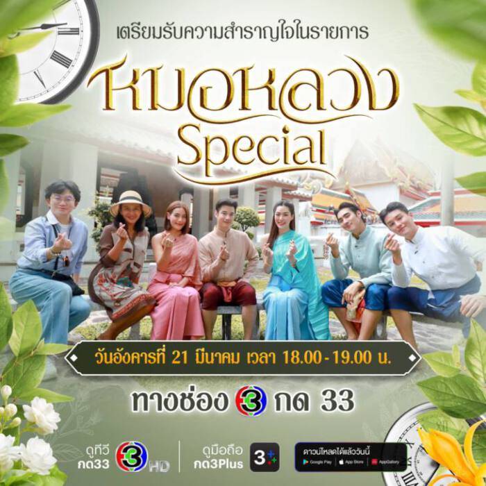 ติดความสนุกสนานของรายการพิเศษ “หมอหลวง Special” ได้วันอังคารที่ 21 มีนาคม 2566 เวลา 18.00-19.00 น. ก่อนไปชมละคร “หมอหลวง” ซึ่งเสนอเป็นตอนแรก เวลา 20.30 น. ดูทีวีกด 33 ดูมือถือกด 3Plus