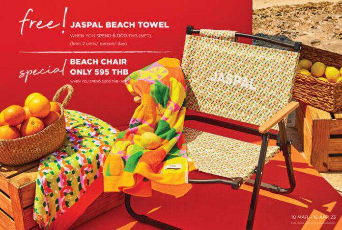 JASPAL (ยัสปาล) ต้อนรับซัมเมอร์สุดฮอตเอาใจสายแฟชั่นให้ช้อปสนุกยิ่งขึ้น จัดเต็มสินค้าพรีเมี่ยมดีไซน์สุดเปรี้ยวจากคอลเลกชั่น Taste of Summer สำหรับเติมความสดใสกับทริปทะเลให้สนุกเกินใคร เพียงช้อปสินค้าภายในร้าน JASPAL หรือช้อปออนไลน์ครบ 6,000 บาทขึ้นไป รับฟรี! JASPAL Beach Towel (มูลค่า 995 บาท) ผ้าขนหนูเนื้อนุ่ม สีสันสดใส ที่เพิ่มลูกเล่นลายพรินท์ของผลไม้ประจำฤดูร้อนทั้งส้มและเลม่อน หรือ ช้อปครบ 3,500 บาทขึ้นไป เฉพาะที่ร้าน JASPAL รับสิทธิ์แลกซื้อเก้าอี้ชายหาด (มูลค่า 1,295 บาท) ในราคาเพียง 595 บาท ซึ่งจัดทำเป็นสินค้า Limited Edition สำหรับซีซั่นนี้เท่านั้น ที่โดดเด่นด้วยลวดลายโมโนแกรมดีไซน์อักษร J ลักษณะ 3 มิติในโทนสีรับซัมเมอร์ทั้งสีส้มและสีเหลือง และเพิ่มความสนุกด้วยสีชมพูและสีเขียว