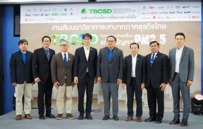 ดร.วิจารย์ สิมาฉายา (กลาง) เลขาธิการองค์กรธุรกิจเพื่อการพัฒนาอย่างยั่งยืน (TBCSD) และผู้อำนวยการสถาบันสิ่งแวดล้อมไทย (TEI) เป็นประธานในพิธีเปิดงานสัมมนาวิชาการ “บทบาทภาคธุรกิจไทย TBCSD ในการร่วมขับเคลื่อนแก้ไขปัญหา PM2.5” โดยมี กฤษณ์ อิ่มแสง, ดร.ปิ่นสักก์ สุรัสวดี, กิตติพันธ์ จันทาศรี, ชาติวุฒิ วังวล พร้อมด้วยผู้บริหารระดับสูงจากหน่วยงานภาครัฐและองค์กรสมาชิกภาคธุรกิจชั้นแนวหน้าของประเทศไทย ร่วมนำเสนอข้อมูล เพื่อให้หน่วยงานและองค์กรต่าง ๆ ได้ตระหนักถึงความสำคัญของการป้องกันและแก้ไขปัญหา PM2.5 และแนวทางการบริหารจัดการแบบบูรณาการให้เกิดผลอย่างเป็นรูปธรรม พร้อมนำเสนอบทสรุปและข้อเสนอแนะเกี่ยวกับมาตรการแก้ไขปัญหา PM2.5 จากกลุ่ม TBCSD ที่จะนำไปขับเคลื่อนและเสนอแนะในระดับนโยบายต่อไป ณ ห้องประชุมสวนสน ชั้น 6 บริษัท ไออาร์พีซี จำกัด (มหาชน) อาคาร ENCO B กรุงเทพฯ เมื่อเร็ว ๆ นี้