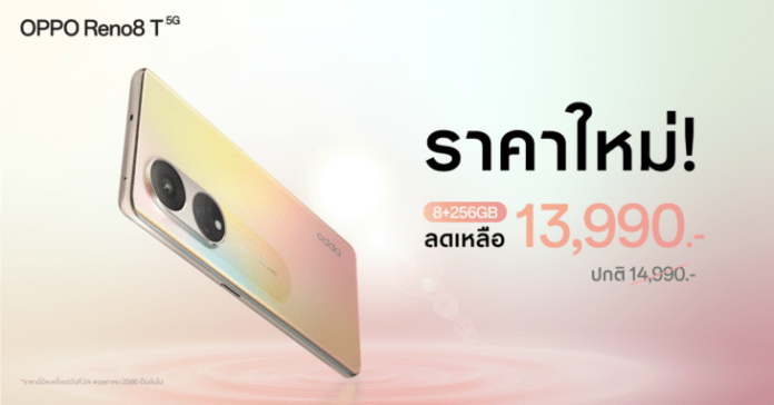 OPPO Reno8 T 5G รุ่น 8+256GB ความจุเยอะขึ้น สมาร์ตโฟน The Portrait Expert ที่ถ่ายพอร์ตเทรตได้สวย คมชัดที่สุดด้วย 108MP Portrait Camera และสเปคอัปเกรดในทุกๆ ด้าน พร้อมให้คุณเป็นเจ้าของได้ง่ายยิ่งขึ้นในราคาใหม่เพียง 13,990 บาท จากราคาปกติ 14,990 บาท ตั้งแต่วันที่ 24 พฤษภาคม 2566 เป็นต้นไป