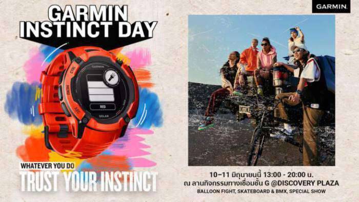 INSTINCT 2X Solar ซีรีย์มาพร้อมตัวเลือก 2 โมเดล ได้แก่ INSTINCT 2X Solar มาในราคา 16,590 บาท และ INSTINCT 2X Solar – Tactical Edition ในราคา 18,390 บาท การ์มินยังเอาใจแฟน INSTINCT จัด “GARMIN INSTINCT DAY” ต่อเนื่องเป็นปีที่ 2 ภายใต้แนวคิด “WHATEVER YOU DO, TRUST YOUR INSTICNT.” ชวนคนไทยสายเอาท์ดอร์สัมผัสประสบการณ์ INSTINCT พร้อมตอกย้ำคาแรคเตอร์สตรีทเอ้าท์ดอร์ ผ่านแอคทิวิตี้สุดมันส์ อาทิ การแข่งขันบอลลูนไฟท์ (Balloon Fight) เปิดพื้นที่ให้เล่นฟรีสำหรับกิจกรรมสเก็ตบอร์ดและ BMX พร้อมโชว์พิเศษจากเกสต์ผู้คร่ำหวอดในวงการ ตั้งแต่วันที่ 10 – 11 มิถุนายน 2566 เวลา 13.00 – 20.00 น. ณ ลานกิจกรรมบริเวณทางเชื่อมชั้น G ดิสคัฟเวอรี่ พลาซ่า สามารถติดตามรายละเอียดกิจกรรมภายในงานเพิ่มเติมได้ทางเฟซบุคแฟนเพจ Garmin Thailand