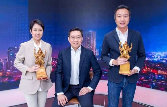 นับเป็นอีกหนึ่งความสำเร็จการันตีสื่อมวลชนทรงคุณค่า…กลุ่มทรู โดย นายองอาจ ประภากมล (กลาง) หัวหน้าสายงานทรูวิชั่นส์และมีเดีย บมจ.ทรู คอร์ปอเรชั่น และกรรมการผู้จัดการ บริษัท ไทย นิวส์ เน็ตเวิร์ค (ทีเอ็นเอ็น) จำกัด (TNN ช่อง 16) และบริษัท ทรูโฟร์ยู สเตชั่น จำกัด (ทรูโฟร์ยู ช่อง 24) พร้อมด้วยนางสาวอัญจนา สิงหเสนี (ซ้าย) ผู้อำนวยการสถานีโทรทัศน์ทรูโฟร์ยู ช่อง 24 และนายอธิพล วงศ์สืบยุทธ์ (ขวา) รองผู้อำนวยการฝ่ายข่าวสถานีโทรทัศน์ TNN ช่อง 16 ร่วมภาคภูมิใจกับรางวัลแห่งความสำเร็จในโอกาสที่กลุ่มทรู คว้า 2 รางวัลเกียรติยศ จากงานประกาศรางวัล “พระพิฆเณศวร์” ครั้งที่ 1 ประจำปี 2566 โดย TNN ช่อง 16 รับรางวัล “สถานีข่าวดีเด่น” สะท้อนจุดยืนด้วยตระหนักถึงการสร้างสรรค์และพัฒนาคอนเทนต์ข่าว “ทันโลก ทันเศรษฐกิจ ทันทุกความจริง” มาเป็นระยะเวลากว่า 15 ปี จนก้าวขึ้นมาเป็นสถานีข่าวคุณภาพอันดับหนึ่งในใจของผู้ชม และสถานีโทรทัศน์ทรูโฟร์ยู ช่อง 24 รับรางวัล “สถานีส่งเสริมภาพยนตร์ไทยดีเด่น” ที่มุ่งมั่นคัดสรรคอนเทนต์คุณภาพและความบันเทิงครบรสเพื่อคนไทยอย่างต่อเนื่องจนได้รับรางวัลการันตีความสำเร็จในครั้งนี้