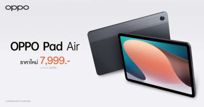 OPPO Pad Air แท็บเล็ตดีไซน์เอกลักษณ์จากออปโป้ มาพร้อมดีไซน์บาง โฉบเฉี่ยว พร้อมให้คุณสนุกได้ไม่จำกัด มาในราคาใหม่เพียง 7,999 บาท จากราคาปกติ 8,999 บาท ตั้งแต่วันที่ 27 มิถุนายน 2566 เป็นต้นไป