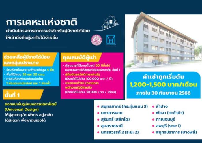 พิเศษ! สำหรับลูกค้าที่กำลังมองหาห้องเช่าราคาประหยัด การเคหะแห่งชาติได้จัด โปรโมชันโครงการห้องเช่าราคาพิเศษ เริ่มต้นเพียง 40 บาทต่อวัน ผู้ที่สนใจโครงการฯ สามารถไปชมสถานที่จริงในทำเลที่ต้องการได้ทันที เพราะทุกห้อง ทุกโครงการ เป็นโครงการที่พร้อมเข้าอยู่อาศัย เพียงแค่มีรายได้ครัวเรือนไม่เกิน 30,000 บาท ทำสัญญาและจ่ายเงินค่าเช่า 1 เดือน และเงินประกันค่าเช่าห้องอีก 1 เดือน (รวมค่าประกันมิเตอร์ไฟฟ้าและน้ำประปาแล้ว) สามารถหิ้วกระเป๋าเข้าอยู่ได้ทันที สิ้นสุดโปรโมชันวันที่ 30 กันยายน 2566