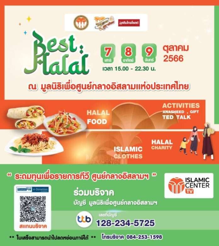 เชิญทุกท่านร่วมงาน ระดมทุนเพื่อรายการทีวี ศูนย์กลางอิสลามฯ ที่งาน “BEST HALAL 2023” ระหว่างวันที่ 7 – 9 ตุลาคม 2566 (วันเสาร์-จันทร์) ณ มูลนิธิเพื่อศูนย์กลางอิสลามแห่งประเทศไทย รามคำแหง ซอย2