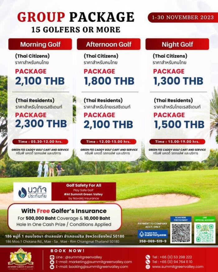 สำหรับแพคเก็จประกันพิเศษประกันนักกอล์ฟรายรอบ คุ้มครองนักกอล์ฟด้วยกรมธรรม์ที่วงเงินคุ้มครองกว่า 500,000 บาท จะเริ่มตั้งแต่ วันที่ 1 พฤศจิกายน 2566 ถึง 31 ธันวาคม 2567 สำหรับนักกอล์ฟที่มาออกรอบที่สนามซัมมิท กรีน วัลเล่ย์ ทุกๆ ท่าน ทั้งชาวไทยและต่างประเทศ