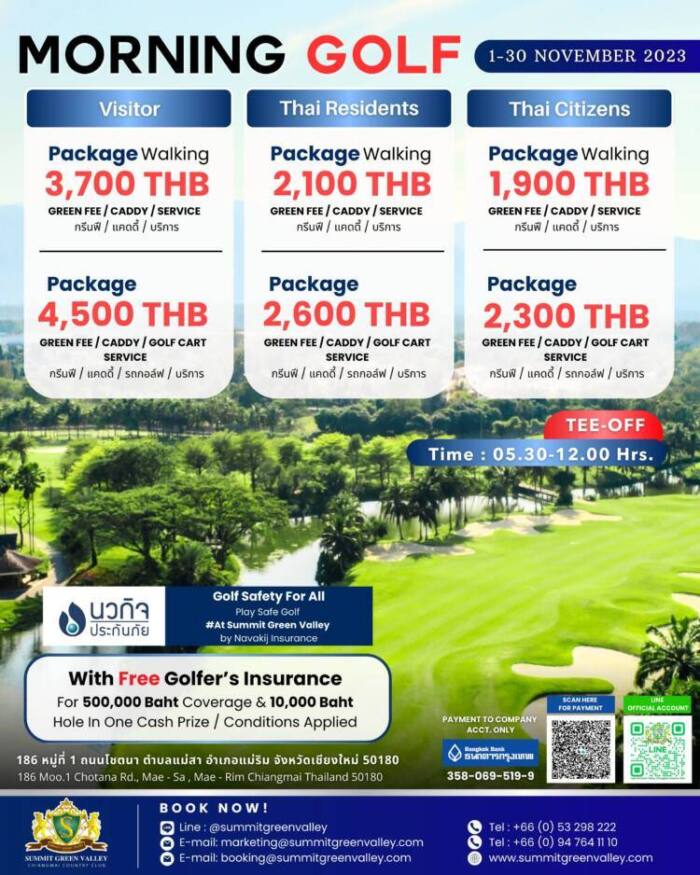 สนามกอล์ฟซัมมิท กรีน วัลเล่ย์ เชียงใหม่ เปิดเกมรุกตลาดเตรียมรับไฮซีซั่น และตลอดปี 2566 – 2569 แจกรางวัลโฮล-อิน-วัน บิ๊กไพร้ซ์ พร้อมจับมือนวกิจประกันภัย เปิดมิติใหม่คุ้มครองความเสี่ยงที่อาจเกิดขึ้นขณะออกรอบ กับแพคเก็จประกันนักกอล์ฟรายรอบ ต้อนรับนักกอล์ฟที่มาออกรอบทั้งชาวไทยและต่างชาติที่จะทำให้ออกรอบได้อย่างไร้กังวล หมดห่วงเรื่องอุบัติเหตุที่อาจเกิดขึ้น