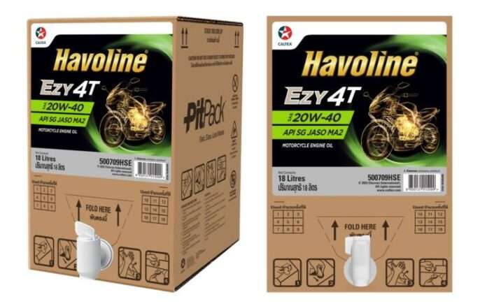 คาลเท็กซ์ ฮาโวลีน สร้างปรากฏการณ์ใหม่เผยโฉม PitPack™ นวัตกรรมบรรจุภัณฑ์น้ำมันหล่อลื่นสำหรับมอเตอร์ไซค์ ตอบโจทย์การใช้งานแบบคุ้มค่าด้วยรูปแบบถุงบรรจุในกล่องกระดาษ หรือ bag-in-a-box ลดขยะพลาสติกถึง 90% เมื่อเปรียบเทียบกับการใช้ขวดแบบใช้ครั้งเดียวทิ้ง โดยนำร่องแนะนำแพ็กเกจใหม่สำหรับน้ำมันเครื่องคาลเท็กซ์ ฮาโวลีน อีซี่ 4ที SAE 20W-40 (Caltex Havoline Ezy 4T SAE 20W-40)