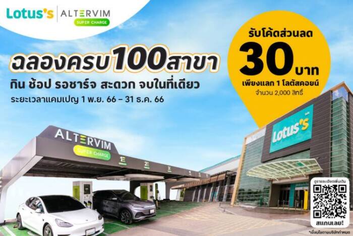 โลตัส ฉลองการเปิดให้บริการ Altervim Super Charge ครบ 100 สาขา ให้ลูกค้ากิน ช้อป รอชาร์จ สะดวกจบในที่เดียว รับโค้ดส่วนลดค่าบริการ 30 บาท เพียงแลก 1 โลตัสคอยน์ (จำกัด 2,000 สิทธิ์) ตั้งแต่วันที่ 1 พ.ย. – 31 ธ.ค. 66 เงื่อนไขเป็นไปตามที่บริษัทฯ กำหนด สามารถตรวจสอบรายละเอียดและสาขาที่ให้บริการได้ทาง https://bit.ly/3s4kiQb