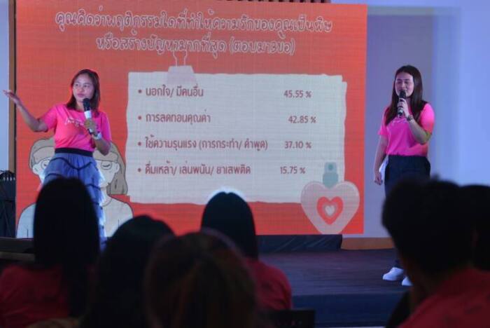 ด้านนางสาวปาลิณี ต่างสี ผู้ประสานงานเครือข่ายเยาวชนลดปัจจัยเสี่ยง กล่าวว่า จากการการสำรวจความคิดเห็นเยาวชนอายุ 13-25 ปี ในกรุงเทพฯ และปริมณฑล 2,000 ตัวอย่าง ช่วงต้นเดือนก.พ. ปี 2567 เรื่อง Love is not toxic รักไม่เป็นพิษ พบว่าพฤติกรรมที่ทำให้รักเป็นพิษมากที่สุดคือการนอกใจ 45.55% การลดทอนคุณค่า 42.85% ใช้ความรุนแรงทั้งคำพูดและการกระทำ 37.1% ความคาดหวัง การกดดัน 33.3% การแสดงความเป็นเจ้าของ 32.2% ความเงียบ ถามไม่ตอบ 28.8% ดื่มเหล้าเล่นพนัน ใช้ยาเสพติด 15.75% ชอบเหวี่ยงชอบวีน 15.1% โมโหร้าย ทำลายข้าวของ 14.6% ขึ้นเสียง แสดงอำนาจ ชักสีหน้าใส่ 14.6% เอาเรื่องส่วนตัวไปเล่าให้คนอื่นฟัง 7.6% ติดเที่ยวกลางคืน ปาร์ตี้ 6.45% เอาเปรียบเรื่องเงิน 5.55%เมื่อเกิดปัญหาแล้วเลือกที่จะปรึกษามากที่สุดคือ เพื่อน 62.05% พ่อแม่ คนในครอบครัว 21.6% ครู อาจารย์ 9.5% และสื่อออนไลน์ 3.75 %