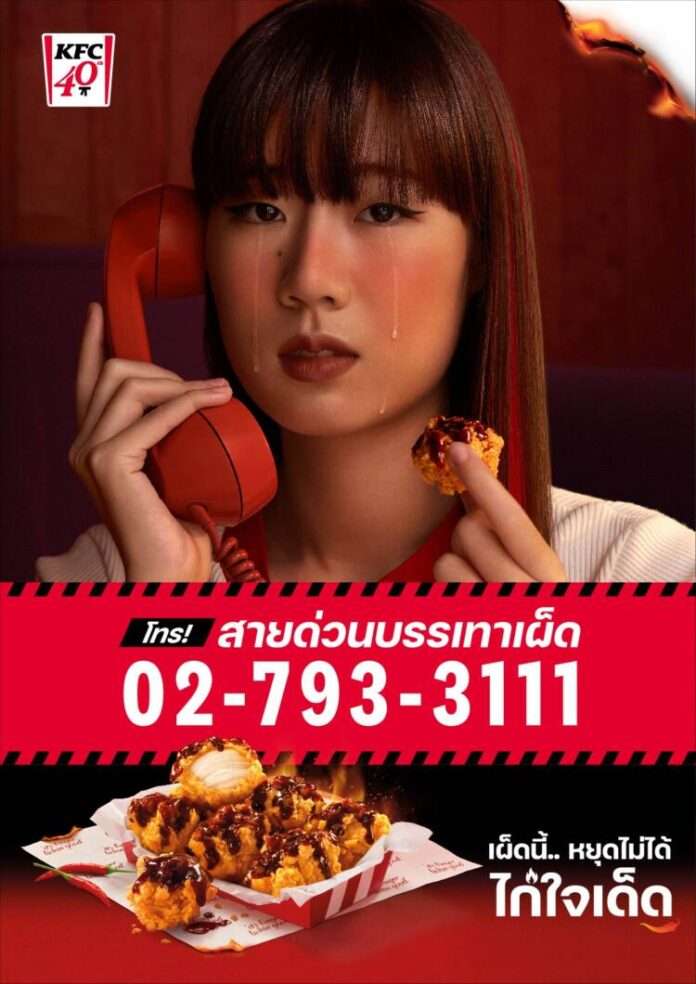 ใครชอบกินเผ็ด ห้ามเลื่อนผ่าน! KFC ฉลองครบรอบ 40 ปี ขอท้าคนคลั่งรักความเผ็ดให้ต้องซี้ดปาก ปาดเหงื่อ ปาดน้ำตา ไปด้วยกัน กับ “ไก่ใจเด็ด เผ็ดนี้ หยุดไม่ได้” ที่นั่งยัน นอนยันเลยว่าเผ็ดสะใจสายเผ็ดทั้งหลายแน่นอน แต่ผู้พันจะไม่ปล่อยให้คุณต้องสู้ทนกับความแสบร้อนนี้คนเดียวแน่นอน เพราะรอบนี้ KFC จัด Hotline สายด่วนบรรเทาเผ็ด ที่จะมาช่วยให้คนใจเด็ดเอาชนะความเผ็ดร้อนนี้ไปพร้อมๆกัน