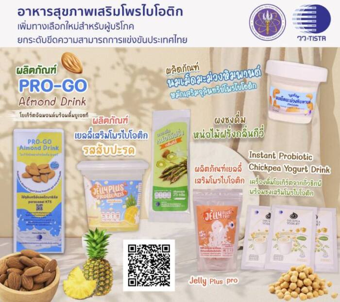 1) ผลิตภัณฑ์เยลลี่เสริมโพรไบโอติก ไม่แต่งสีและกลิ่น ใช้สารให้ความหวาน มี 2 รูปแบบ ได้แก่ 1. รูปแบบแผ่น ให้พลังงาน 15 กิโลแคลอรี่ ไม่มีน้ำตาล (Sugar free) ไม่มีคอเลสเตอรอล และไขมันอิ่มตัว มีการเติมโพรไบโอติกประจำถิ่น (ประเทศไทย) ที่มีข้อมูลผลการศึกษาและวิจัยสนับสนุนสรรพคุณต่อสุขภาพหลายประการโดยทีมนักวิจัยจาก วว. จุลินทรีย์ชนิดนี้ไม่มีฤทธิ์ต่อฮีโมไลติก (ไม่ย่อยสลายเม็ดเลือดแดง) ไม่ดื้อต่อยาปฏิชีวนะต่างๆ เช่น Ampicillin Tetracycline เป็นต้น และมีประสิทธิภาพในการต้านเชื้อก่อโรคในระบบทางเดินอาหาร มีประโยชน์ต่อร่างกาย และ 2.โยเกิร์ตพร้อมบริโภครสสับปะรด มีปริมาณโพรไบโอติกสูงในรูปแบบเม็ดบีดส์ (Gelling beads) ให้พลังงาน 70 กิโลแคลอรี่ ไม่มีคอเลสเตอรอลและไขมันอิ่มตัว มีแคลเซียม มีเนื้อสัมผัสนุ่ม ใส และมีความยืดหยุ่น