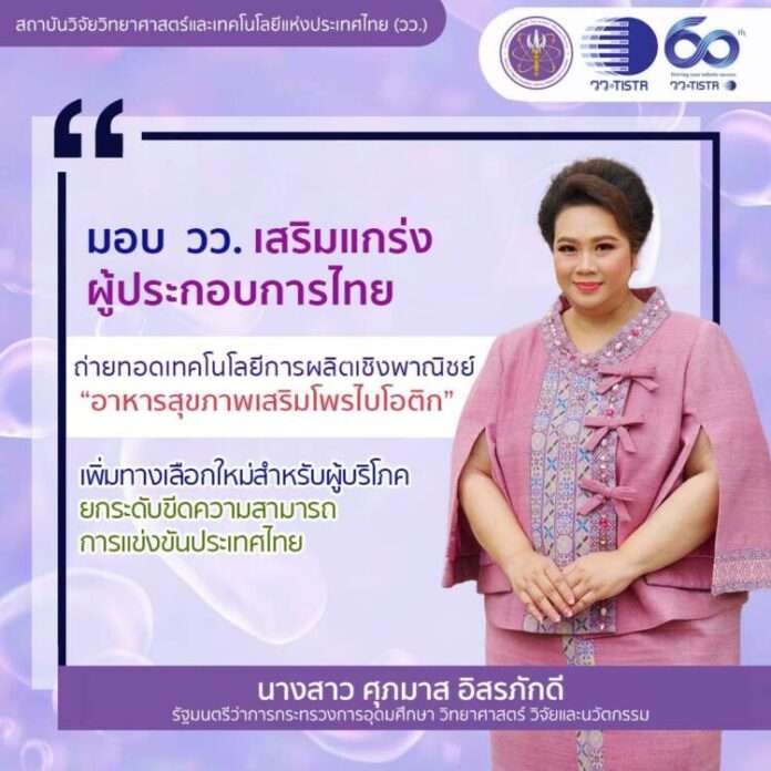 กระทรวงการอุดมศึกษา วิทยาศาสตร์ วิจัยและนวัตกรรม (อว.) โดย สถาบันวิจัยวิทยาศาสตร์และเทคโนโลยีแห่งประเทศไทย (วว.) ดำเนิน โครงการพัฒนาผลิตภัณฑ์อาหารฟังก์ชันสำหรับประชากรวัยทำงานและผู้สูงวัยจากสารออกฤทธิ์เชิงหน้าที่ที่มีศักยภาพสูงจากจุลินทรีย์เป้าหมายและทรัพยากรพื้นถิ่น ตามนโยบายรัฐบาลและนโยบาย นางสาวศุภมาส อิศรภักดี รัฐมนตรีว่าการกระทรวง อว. โชว์ความสำเร็จงานวิจัยพัฒนา “ผลิตภัณฑ์เพื่อสุขภาพเสริมโพรไบโอติก” พร้อมถ่ายทอดเทคโนโลยีการผลิตสู่เชิงพาณิชย์ เพื่อเพิ่มทางเลือกใหม่ให้ผู้บริโภค พร้อมเสริมแกร่งผู้ประกอบการในการดำเนินธุรกิจด้วยผลงานนักวิจัยไทย ตอบโจทย์และแก้ไขปัญหาของสังคม เพิ่มศักยภาพการแข่งขันทั้งภายในประเทศและต่างประเทศ