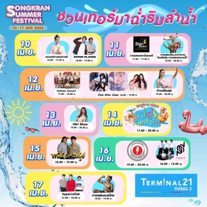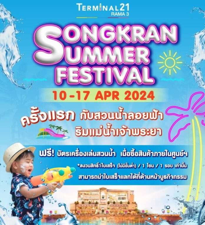 เทอร์มินอล21 พระราม3 สาดสนุกความฉ่ำ ดับร้อนต้อนรับเทศกาลสงกรานต์ ในงาน “Songkran Summer Festival 2024” สุดว้าวกับสวนน้ำลอยฟ้าริมแม่น้ำเจ้าพระยา อัดแน่นกิจกรรมสนุก เฟ้นหาหนูน้อยสงกรานต์ และมินิคอนเสิร์ตศิลปินดัง 10-17 เมษายนนี้