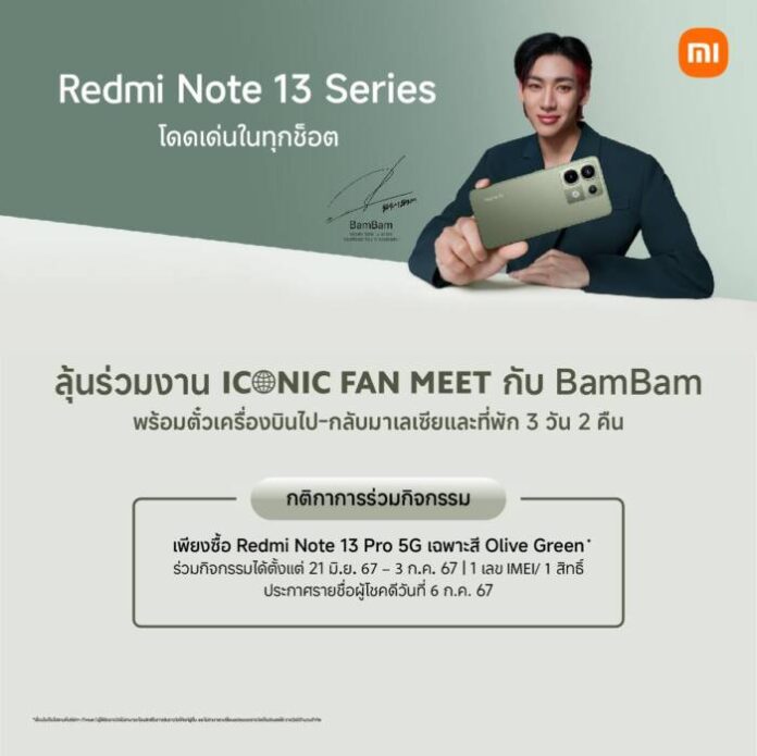 เสียวหมี่มอบสิทธิพิเศษให้ลูกค้าที่ซื้อ Redmi Note 13 Pro 5G สีใหม่ Olive Green ลุ้นร่วมงาน ICONIC FAN MEET กับ BamBam ที่ประเทศมาเลเซีย