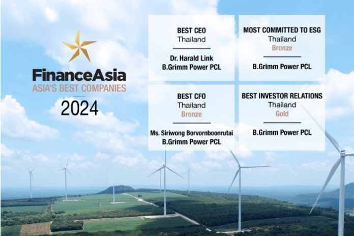 บริษัท บี.กริม เพาเวอร์ จำกัด (มหาชน) หรือ BGRIM หนึ่งในผู้ผลิตและจำหน่ายไฟฟ้าเอกชนชั้นนำของประเทศ ไทย ด้วยวิสัยทัศน์ “สร้างพลังให้กับสังคมโลกด้วยความโอบอ้อมอารี” ตอกย้ำศักยภาพการดำเนินธุรกิจ โดยได้รับ 4 รางวัลจากการประกาศรายชื่อสุดยอดบริษัทแห่งเอเชีย ประจำปี 2567 (Finance Asia Asia’s Best Companies 2024) จัดโดยนิตยสารไฟแนนซ์เอเชีย (FinanceAsia) นิตยสารการเงินการลงทุนชั้นนำของภูมิภาคเอเชีย มอบรางวัลในหมวดต่างๆ แก่องค์กรชั้นนำของเอเชีย จากการสำรวจความคิดเห็นของผู้จัดการกองทุน นักวิเคราะห์ และนักการเงินในภูมิภาค