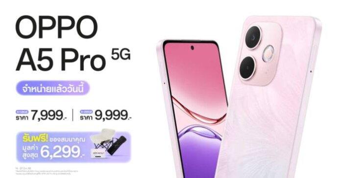 OPPO ประกาศวางจำหน่าย “OPPO A5 Pro 5G” สมาร์ตโฟนสวย ครบ จบทุกดาเมจจากตระกูลซีรีส์ A อย่างเป็นทางการในประเทศไทย สมาร์ตโฟนที่สุดของความทนทานมาพร้อม 2 ความจุ ได้แก่ OPPO A5 Pro 5G (6+128GB) ในราคาเพียง 7,999 บาท และ OPPO A5 Pro 5G (8+256GB) ในราคาเพียง 9,999 บาท พร้อมรับฟรีของสมนาคุณ มูลค่าสูงสุด 6,299 บาท OPPO A5 Pro 5G พร้อมมอบประสบการณ์ความทนทาน และมาพร้อมความบันเทิงในราคาสุดคุ้ม จัดเต็มทุกการอัปเกรด ทั้งดีไซน์ คุณภาพ การชาร์จ ประสิทธิภาพ กล้อง และอีกมากมาย มาพร้อมกับ OPPO Enco Buds3 Pro หูฟังไร้สายแบตอึดใช้งานได้ตลอดวันในราคาสุดคุ้มเพียง 999 บาทเท่านั้น!