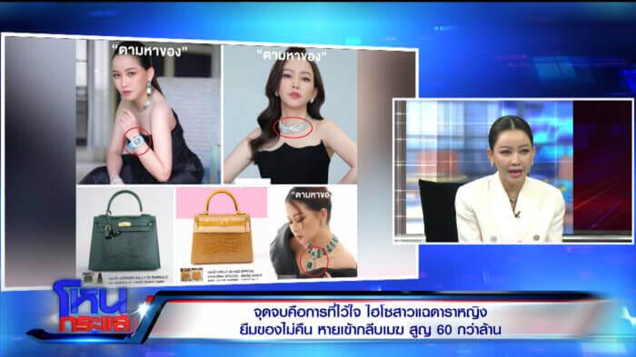 เมย์ : ใช่ค่ะ เขาบอก ตอนแรกหนูได้ยินมาจากรุ่นน้อง บอกว่าพี่เมย์ ของพี่เมย์ไม่ได้อยู่ที่เขาแล้วนะ ของพี่เมย์ถูกเอาไปจำนำ หนูก็คิดว่าใช่เหรอ ไม่ใช่มั้ง หนูไปถามเขาตรงๆ เขาก็บอกตรงๆ ว่าเขาเอาไปจำนำไว้กี่แห่งบ้าง แต่ไม่บอกว่าที่ไหน บอกว่าเอาไว้ที่ร้านนาฬิกา ซึ่งหนูทราบมาว่าร้านนี้ใช่มั้ย เขาก็บอกว่าใช่ นาฬิการิชาร์ด มิลล์ 1 เอาไปไว้ที่ร้านนึง อีกอันนึงก็เป็นร้านแบรนด์เนมเหมือนกัน อีกสองอันเขาบอกเอาไว้กับผู้ใหญ่แต่เขาไม่ยอมบอก ถึงวันนี้ก็ไม่บอกว่าของอยู่ที่ไหน แต่เขาบอกประมาณวันที่ 24 ว่าเอาไปจริงๆ เพื่อร้องขอให้เมย์ไปเอาของจ่ายเงิน 20 ล้านเอาของออกมาก่อนได้มั้ย แล้วจะเคลียร์หนูเอง
