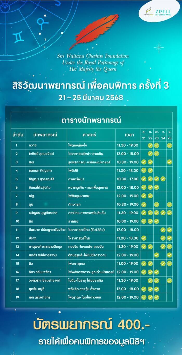 ศูนย์การค้าฟิวเจอร์พาร์คและสเปลล์ ร่วมกับมูลนิธิสิริวัฒนาเชสเชียร์ ในพระบรมราชินูปถัมภ์ จัดงาน “สิริวัฒนาพยากรณ์ เพื่อคนพิการ” ครั้งที่ 3 มหกรรมรวมสุดยอดนักพยากรณ์ชื่อดังระดับประเทศกว่า 19 ท่าน ที่พร้อมเปิดดวงชะตาให้คำปรึกษาและไขข้อสงสัยในทุกเรื่องของชีวิต ตั้งแต่เรื่องความรัก การงาน การเงิน ไปจนถึงสุขภาพและโชคลาภ ตั้งแต่วันที่ 21-25 มีนาคม 2568 ณ บริเวณชั้น 2 ฝั่งเวสต์ ศูนย์การค้าฟิวเจอร์พาร์ค ตั้งแต่เวลา 10.30 – 19.00 น.