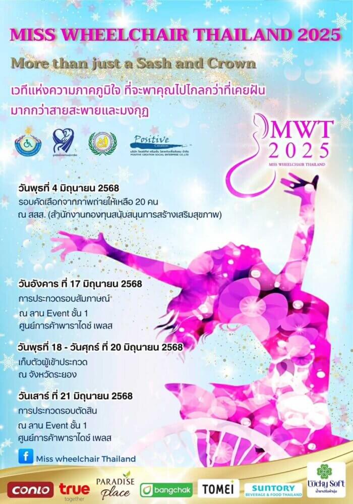 เสียงแห่งความหวังและความฝันของผู้หญิงที่ใช้รถวีลแชร์ทั่วประเทศดังกระหึ่มอีกครั้ง! กับการกลับมาอย่างทรงพลังของเวที Miss Wheelchair Thailand 2025 ที่หลายคนเฝ้ารอคอย โดย มูลนิธิพระมหาไถ่เพื่อการพัฒนาคนพิการ มูลนิธิเพื่อสตรีคนพิการไทย สมาคมคนพิการภาคตะวันออก และ บริษัท โพสซิทีฟ ครีเอชั่น วิสาหกิจเพื่อสังคม จำกัด ได้ประกาศผลผู้ผ่านเข้ารอบ 20 คน จากการคัดเลือกรอบแรกด้วยภาพถ่ายและวีดิโอ โดยมีคณะกรรมการผู้ทรงคุณวุฒิจากหลากหลายวงการ ทั้งคนพิการและไม่พิการ ร่วมกันพิจารณาอย่างเข้มข้น อาทิเช่น คุณอรอนงค์ ปัญญาวงศ์ นางสาวไทยปี 2535 คุณเจฟฟรี่ เบญจกุล ดารานักแสดง คุณพันธ์สิริ สิริเวชชะพันธ์ ช่างภาพแฟชั่นแถวหน้าของเมืองไทย คุณณรงค์ ไปวันเสาร์ นายกสมาคมคนพิการภาคตะวันออก เป็นต้น