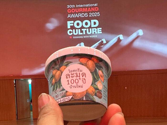 ทั้งนี้ รางวัล Gourmand World Cookbook Awards เป็นรางวัลที่มอบให้แก่หนังสืออาหารที่มีความโดดเด่นจากทั่วโลก โดยในปี 2568 “ไอศกรีมละมุด 100 ปี” ซึ่งเป็นผลิตโอทอป จ.พระนครศรีอยุธยา ได้รับรางวัลชนะเลิศ ประเภทไอศกรีม (ICE CREAM) โดยในประเภทนี้มีผลงานผ่านเข้ารอบสุดท้ายจาก 6 ประเทศ ได้แก่ แคนาดา – Awesome Ice Pops, Andrew Chase (Robert Rose) • เดนมาร์ก – Sorbett, Karl Lundin • Italy – Gelaterie d’Italia (Gambero Rosso) • ประเทศไทย – Sapodilla Ice Cream, Suthipong Suriya, Ban Mai Subdistrict Administrative organisation (Karb Studio) • ตองกา – Vei’s Vanilla Ice Cream (Children of the Pacific) และ สหราชอาณาจักร – The Science of Ice Cream, Chris Clarke, Andrew Cox (Royal Society of Chemistry)