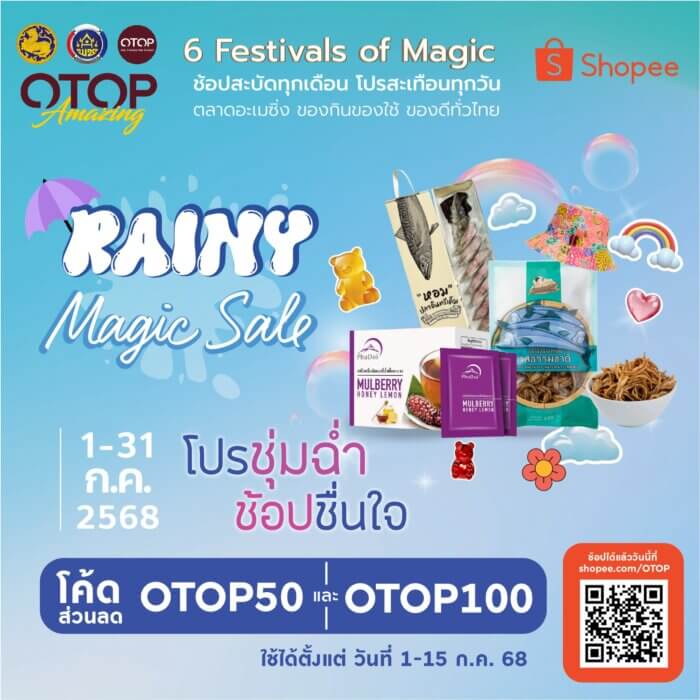 ทั้งนี้แคมเปญ “OTOP Amazing – Rainy Magic Sale” ซึ่งเป็นแคมเปญแรกของโครงการจัดขึ้นระหว่างวันที่ 1-31 กรกฎาคม 2568 บนช้อปปี้ ที่พร้อมรับโค้ดส่วนลดหลากหลายรูปแบบสูงสุดถึง 50% ผู้สนใจสามารถติดตามและสั่งซื้อได้ที่ https://shopee.co.th/otop หรือ พิมพ์คำว่า OTOP หรือ โอทอป ในช่องค้นหาในแพลตฟอร์ม ช้อปปี้ ได้ตลอดทุกวัน 24 ชม.