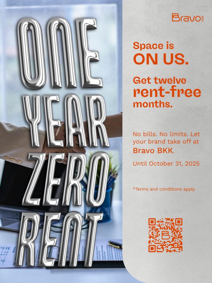 เพื่อตอกย้ำถึงแผนครึ่งปีหลังที่ต้องการสร้างพันธมิตรใหม่ ๆ แคมเปญ “One Year Zero Rent” จึงเป็นการมอบข้อเสนอสุดพิเศษให้แบรนด์และผู้ประกอบการที่มองหาพื้นที่ในการเริ่มต้นธุรกิจหรือขยายธุรกิจเช่าพื้นที่ฟรีนาน 12 เดือน เมื่อเซ็นต์สัญญาเช่าพื้นที่กับ Bravo BKK ตามเงื่อนไขที่กำหนด (สัญญาเช่า 3 ปี: ปีที่ 1 ฟรีค่าเช่า 100% ปีที่ 2 รับส่วนลดค่าเช่า 50% และปีที่ 3 ชำระค่าเช่าในอัตราปกติ) ตั้งแต่วันที่ 1 สิงหาคม 2568 – 31 ตุลาคม 2568 โดยผู้ประกอบการที่สนใจสามารถส่งโปรไฟล์ธุรกิจ ร้านค้า เพื่อพิจารณาเข้าร่วมแคมเปญได้ที่ อีเมล : leasingandevent-team@bravobkk.co.th หรือ Line Official @Bravo BKK