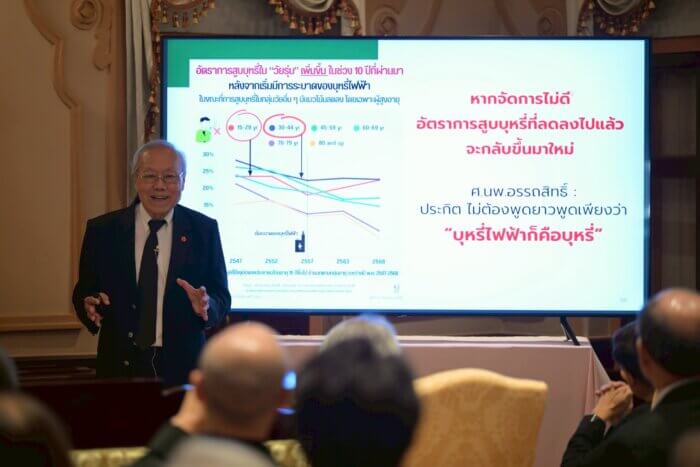 ราชบัณฑิตยสภาสดุดีคุณูปการ “ศ.นพ.อรรถสิทธิ์ เวชชาชีวะ” ผู้วางรากฐานสังคมไทยปลอดบุหรี่ ด้าน “หมอประกิต” จี้รัฐบาลปราบปรามบุหรี่ไฟฟ้าอย่างจริงจัง หลังพบสถิติเยาวชนเสพติดบุหรี่ไฟฟ้าพุ่งกระฉูด วอนรัฐบาลให้ความสำคัญบังคับใช้กฎหมายควบคุมยาสูบอย่างเด็ดขาด