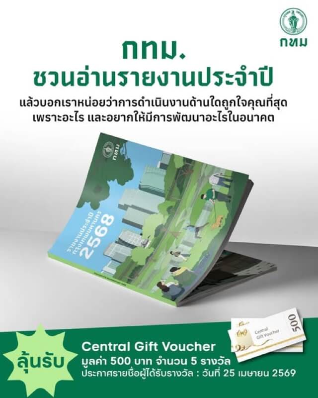 กรุงเทพมหานคร ชวนอ่านรายงานประจำปี 2568 ของกรุงเทพมหานคร และตอบคอมเมนต์ใต้โพสต์เพจเฟซบุ๊ก : กรุงเทพมหานคร จากคำถามที่ว่า “การดำเนินงานด้านใดถูกใจคุณที่สุด เพราะอะไร และอยากให้มีการพัฒนาอะไรในอนาคต” และมีโอกาสรับ Central Gift Voucher มูลค่า 500 บาท จำนวน 5 รางวัล