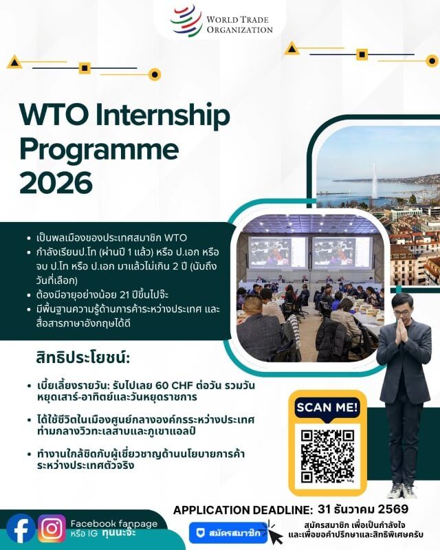 องค์การค้าโลก (World Trade Organization) หรือ WTO เปิดรับสมัครผู้จบการศึกษาในระดับปริญญาเอกและปริญญาโท ฝึกงานที่สำนักงาน WTO ณ กรุงเจนีวา ประเทศสวิตเซอร์แลนด์ ภายใต้โครงการ WTO Internship 2026 โดยเปิดรับในสาขากฎหมาย, สถิติ, ไอที, การสื่อสาร และ HR ระยะเวลาการฝึกงาน 3 – 6 เดือน (เริ่มตอนไหนก็ได้ตามตกลง)