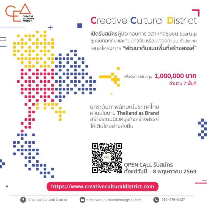 สำนักงานส่งเสริมเศรษฐกิจสร้างสรรค์ (องค์การมหาชน) หรือ CEA ชวนผู้ประกอบการ Startup ชุมชน นักออกแบบ และนักวิจัยทั่วประเทศ มาร่วม “เปลี่ยนพื้นที่ของคุณ” ให้เป็นพื้นที่สร้างสรรค์ที่เกิดขึ้นได้จริง ในโครงการ“พัฒนาต้นแบบพื้นที่สร้างสรรค์ ปี 2569” (Creative Cultural District 2026: CCD) เพื่อร่วมยกระดับภาพลักษณ์ประเทศด้วยอัตลักษณ์ท้องถิ่น และสร้างระบบนิเวศสร้างสรรค์ของชุมชนให้เติบโตได้อย่างยั่งยืน (Spark the District) โดยจะให้ทุนสนับสนุน 1,000,000 บาท จำนวน 7 พื้นที่ทั่วประเทศ