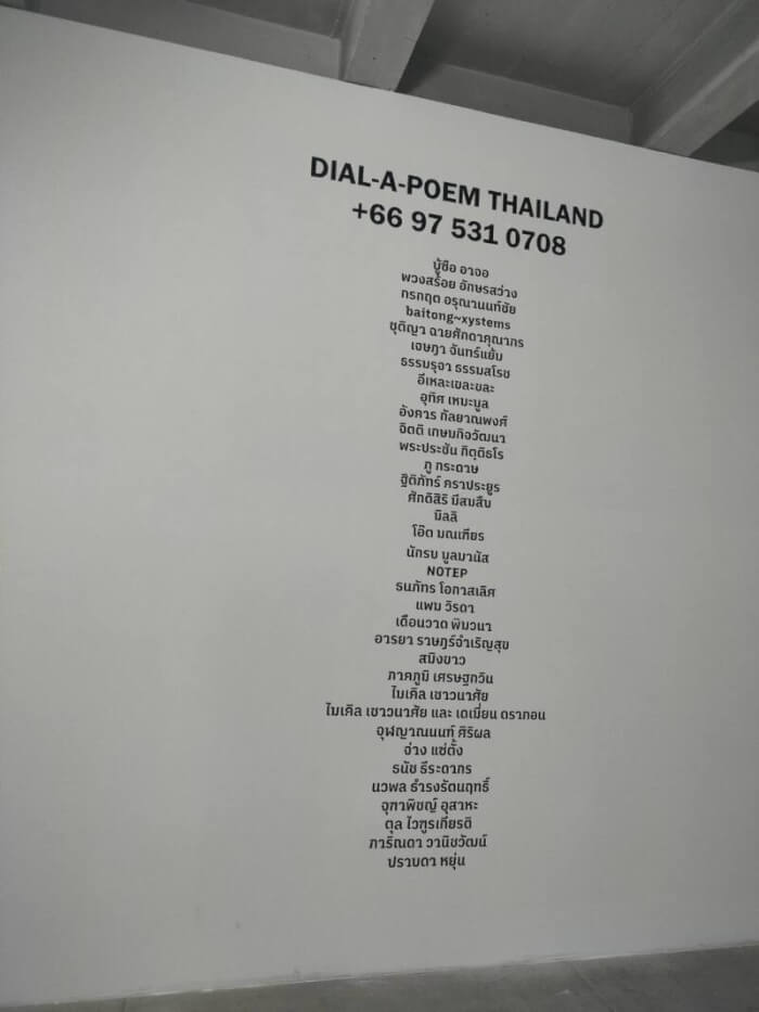 บางกอก คุนส์ฮาเลอ (Bangkok Kunsthalle) ร่วมกับ จอร์โน โพเอทรี ซิสเตมส์ (Giorno Poetry Systems) รวบรวมศิลปินไทยทั้ง 35 คน จากหลากหลายแขนง ตั้งแต่กวี ศิลปินทัศนศิลป์ ผู้กำกับภาพยนตร์ ศิลปินเสียง และศิลปินเพอร์ฟอร์แมนซ์ รวมเป็นเสียงอยู่ในเบอร์โทรศัพท์ที่เราสามารถโทรไปฟังบทกวีได้