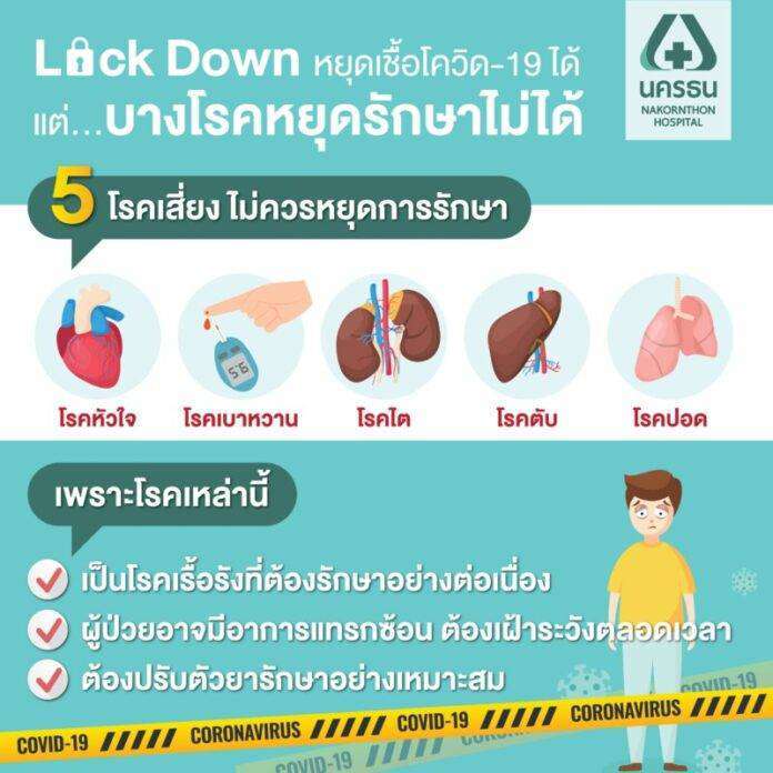 ในสภาวะวิกฤตของโรคระบาดโควิด-19 ส่งผลให้ประชาชนส่วนใหญ่ต้องกักตัวอยู่บ้าน หลาย ๆ จังหวัดมีการ Lock Down เกิดขึ้น เพื่อลดจำนวนผู้ติดเชื้อไวรัสโคโรนา 2019 และเพื่อความปลอดภัยของทุกคน แต่สำหรับผู้ป่วยที่มีโรคประจำตัวคงใช้ชีวิตในสถานการณ์นี้อย่างยากลำบาก หลายคนมีความกังวลที่จะต้องเดินทางมาโรงพยาบาล เพื่อรักษาโรคประจำตัวอย่างต่อเนื่องตามแพทย์สั่ง แต่ในความเป็นจริงแล้ว หากหยุดการรักษาอย่างต่อเนื่อง อาจมีผลเสียต่อสุขภาพและมีความเสี่ยงมากกว่า