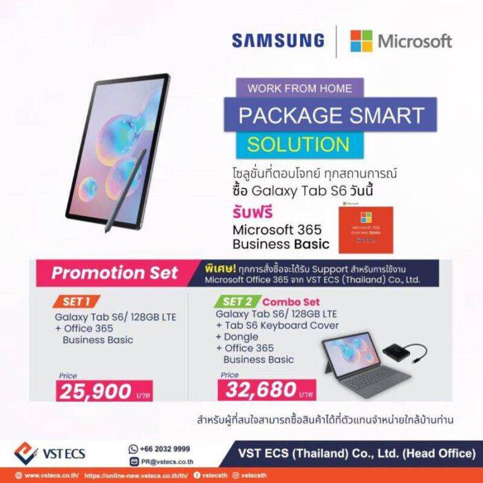 2. WFH Smart Package II Samsung Galaxy Tab S6 ความจุ 128 GB LTE  ที่มีให้เลือกถึง 2 เซต ได้แก่ เซตที่ 1 Galaxy Tab S6 เฉพาะตัวเครื่อง และ Microsoft Office 365 Business Essential 1 ปี ในราคา 25,900 บาท และ เซตที่ 2 Galaxy Tab S6 พร้อมอุปกรณ์เสริม Keyboard Cover และ Dongle และ Microsoft Office 365 Business Essential 1 ปี ในราคา 32,680 บาท โดย Galaxy Tab S6 จะมาพร้อมปากกา S Pen แบบชาร์จแบตเตอรี่ และ Secure Folder เหมือนใน Galaxy Tab A 8.0” Plus นอกจากนี้ ยังมาพร้อมกับ Samsung DeX ที่ช่วยให้ผู้ใช้ทำงานเชื่อมต่อระหว่างแท็บเล็ตและคอมพิวเตอร์ได้อย่างลงตัวและมีประสิทธิภาพมากยิ่งขึ้น ผ่านแอพพลิเคชันหลากหลาย ครอบคลุมทั้ง Microsoft Office, Outlook, และอื่น ๆ อีกมากมาย รวมทั้งสามารถจัดประชุมผ่านวิดีโอคอลได้อย่างสะดวกสบาย โดยแชร์การทำงานบนหน้าจอแท็บเล็ตขึ้นบนหน้าจอทีวีหรือจอมอนิเตอร์ได้อย่างง่ายดาย ผ่าน Dongle ที่แถมมาให้กับเซตที่ 2 หรือ เชื่อมต่อแบบไร้สายสำหรับมอนิเตอร์ขนาด 5”