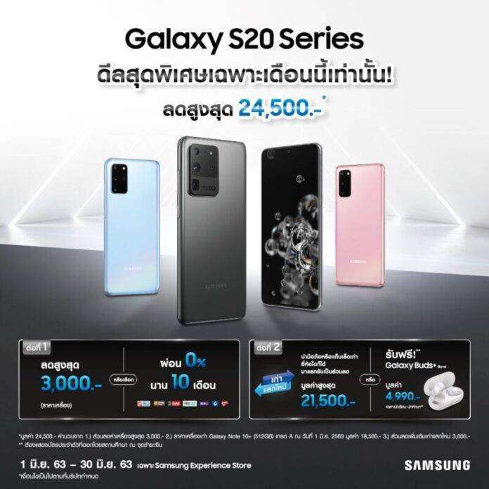 ความพิเศษต่อที่ 1 เมื่อซื้อ Galaxy S20 series รับทันทีส่วนลดสูงสุด 3,000 บาท หรือเลือกรับผ่อน 0% นาน 10 เดือน พร้อมรับเงินคืน 3% (เฉพาะธนาคารที่ร่วมรายการ)