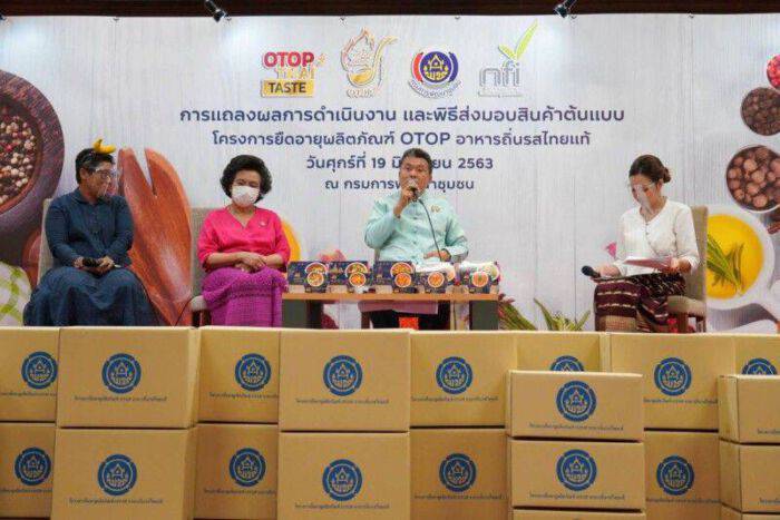 ในปี 2563 นี้ กรมการพัฒนาชุมชน จึงได้จัดทำ “โครงการยืดอายุผลิตภัณฑ์ OTOP อาหารถิ่นรสไทยแท้” โดยมีจุดมุ่งหมายในการพัฒนาอาหารไทยที่มีสมุนไพรที่ดีต่อสุขภาพของผู้บริโภคมาพัฒนา โดยนำนวัตกรรมและเทคโนโลยีการผลิตมาใช้เพื่อการยืดอายุผลิตภัณฑ์ พัฒนาเป็นสินค้าอาหารแปรรูป ที่สะดวกต่อการบริโภค สอดคล้องตามความต้องการของผู้บริโภคในปัจจุบัน รสชาติอร่อย แต่ยังคงคุณประโยชน์ คุณภาพ และความปลอดภัย เพิ่มการออกแบบบรรจุภัณฑ์ใหม่ และใช้ตราสัญลักษณ์หรือแบรนด์ OTOP Thai Taste ระบุข้อมูลโภชนาการต่อหน่วยบริโภค และจุดเด่นเรื่องราว (Story) ของผลิตภัณฑ์ ลงบนฉลากบรรจุภัณฑ์ตามมาตรฐานสินค้าระดับสากล โดยนอกจากได้ผลิต ภัณฑ์ใหม่ในท้องตลาด ยังเป็นการเพิ่มมูลค่าและกระจายรายได้ไปสู่ชุมชน เดิมจากอาหารที่ปรุงสดในราคา 30 บาท สามารถเพิ่มมูลค่าให้แก่ผลิตภัณฑ์ OTOP ได้ในราคาขาย 50 บาทหรืออาจสูงกว่า จากการสำรวจปี 2562 มีครัวเรือนทั่วประเทศ 21 ล้านครัวเรือน หากแต่ละครัวเรือนซื้อผลิตภัณฑ์ OTOP อาหารถิ่นรสไทยแท้ 1 ถ้วย/ปี จะได้ 21 ล้านถ้วย สามารถสร้างรายได้ไม่น้อยกว่า 1,050 ล้านบาท ซึ่งรายได้ดังกล่าวจะกระจายกลับคืนสู่ชุมชนและอีกหลายชีวิต ก่อให้เกิดการขยายตัวของเศรษฐกิจฐานรากได้ สร้างงาน สร้างรายได้ สร้างความเข้มแข็งในระดับชุมชนอย่างยั่งยืน