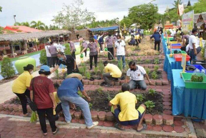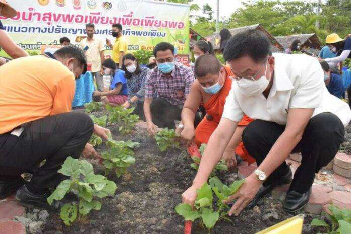 โดยมีนายชรัส บุญณสะ ผู้ว่าราชการจังหวัดสมุทรสงคราม เป็นประธานฝ่ายฆราวาสพร้อมด้วยหัวหน้าส่วนราชการระดับจังหวัดและอำเภอ กำนัน ผู้ใหญ่บ้านและประชาชนจิตอาสาร่วมโครงการนำสุขพอเพียงเพื่อเพียงพอ ตามแนว ทางปรัชญาของเศรษฐกิจพอเพียง ร่วมกับโครงการปลูกผักสวนครัว เพื่อสร้างความมั่นคงทางอาหาร Quick win 90 วัน โครงการนี้เกิดจากสำนักงานพัฒนาชุมชนจังหวัดสมุทรสงคราม ได้ร่วมกับสำนักพุทธศาสนาจังหวัดสมุทรสงคราม เชิญชวนวัดใช้พื้นที่ให้เกิดประโยชน์ “ปลูกผักสวนครัวเพื่อสร้างความมั่นคงทางอาหาร”