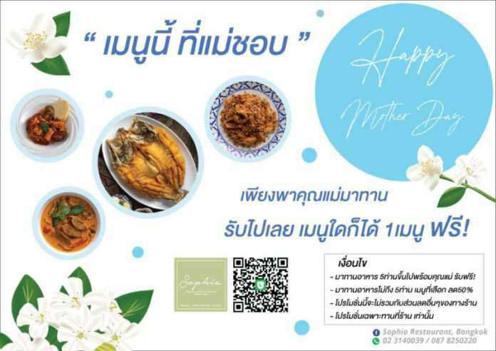 วันแม่ นี้มีโปรโมชั่นดีๆมาฝากลูกๆที่อยากพาคุณแม่ออกไปทานข้าวกันพร้อมหน้าทั้งครอบครัว ให้คุณแม่ได้เลือกเมนูที่ท่านชื่นชอบทานไปเลยฟรี!! 1เมนู!! หรือครอบครัวเล็กไม่ถึง 5ท่าน ก็สามารถได้สิทธิเมนูที่ชอบ ในราคา 50% ทันที 1เมนู เช่นกันนะคะ