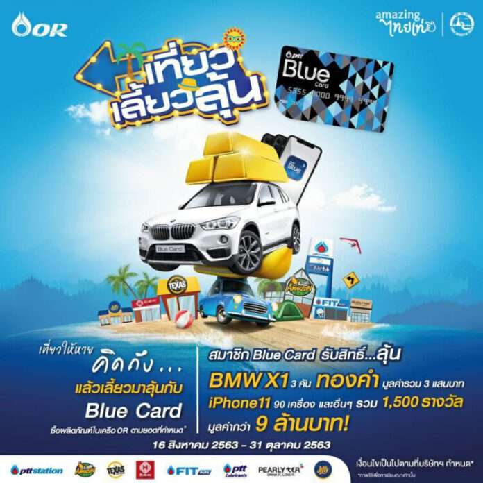 นางสาวจิราพร ขาวสวัสดิ์ ประธานเจ้าหน้าที่บริหารและกรรมการผู้จัดการใหญ่ บริษัท ปตท. น้ำมันและการค้าปลีก จำกัด (มหาชน) (โออาร์) และ นายยุทธศักดิ์ สุภสร ผู้ว่าการการท่องเที่ยวแห่งประเทศไทย (ททท.) ร่วมเชิญชวนคนไทยเที่ยวเมืองไทยกับแคมเปญ “เที่ยว เลี้ยว ลุ้น” มอบสิทธิพิเศษสำหรับสมาชิก Blue Card รับสิทธิลุ้นรับรางวัลใหญ่ รถยนต์ BMW X1 sDrive 18i (Iconic) 3 รางวัล ทองคำมูลค่ารวม 300,000 บาท และของรางวัลอื่น ๆ รวมกว่า 1,500 รางวัล รวมมูลค่ากว่า 9 ล้านบาท เมื่อซื้อสินค้าหรือใช้บริการที่ร้านค้าในเครือของโออาร์ทั่วประเทศ ระหว่างวันที่ 16 สิงหาคม 2563 – 31 ตุลาคม 2563