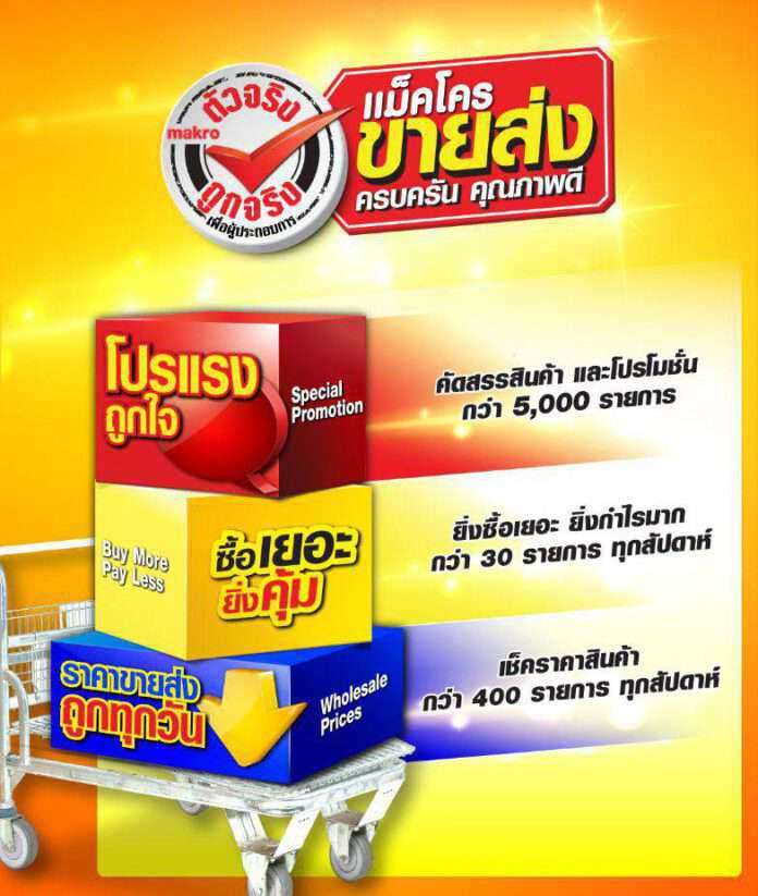 สำหรับแคมเปญ “แม็คโคร ตัวจริง ถูกจริง ราคาขายส่ง ถูกทุกวัน” ประกอบด้วย 3 กลยุทธ์หลัก ทั้งโปรแรงถูกใจ (Special Promotion) คัดสรรสินค้าและโปรโมชั่นกว่า 5,000 รายการ, ซื้อเยอะยิ่งคุ้ม(Buy More Pay Less) กับสินค้ากว่า 40 รายการหมุนเวียนให้เลือกซื้อทุกสัปดาห์, ราคาขายส่งถูกทุกวัน (Wholesale Price) สร้างความมั่นใจด้วยรายการสินค้าราคาดีที่สุด ที่แม็คโครทุกสาขาทั่วประเทศและแม็คโครคลิกที่เป็นแพลตฟอร์มอี-คอมเมิร์ซ