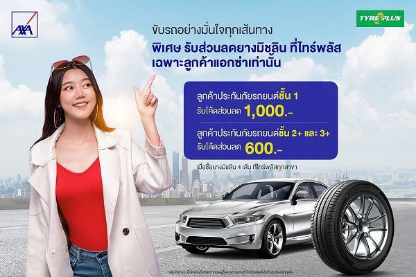 แอกซ่าประกันภัย บริษัทชั้นนำธุรกิจประกันภัยระดับโลก ร่วมกับพันธมิตรทางธุรกิจ ‘ไทร์พลัส’ ศูนย์บริการรถยนต์และยางรถยนต์ครบวงจร มอบสิทธิพิเศษสำหรับลูกค้าคนพิเศษ โดยลูกค้าแอกซ่าที่ซื้อหรือต่ออายุกรมธรรม์ประกันภัยรถยนต์ชั้น 1 จะได้รับส่วนลดแทนเงินสดมูลค่า 1,000 บาท และลูกค้าประกันภัยรถยนต์ชั้น 2+ และ 3+ รับส่วนลด 600 บาท สำหรับซื้อยางมิชลิน 4 เส้น โดยส่วนลดดังกล่าวสามารถใช้ได้ที่ไทร์พลัสทุกสาขา แคมเปญนี้เริ่มตั้งแต่วันนี้ – 31 ธันวาคม 2563