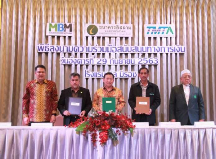 วันที่ 29 กันยายน 2563 ธนาคารอิสลามแห่งประเทศไทย (ไอแบงก์) โดยนายวุฒิชัย สุระรัตน์ชัย กรรมการและผู้จัดการ ลงนามความร่วมมือ สนับสนุนทางการเงินระหว่างธนาคารอิสลามแห่งประเทศไทย กับกลุ่ม Muslim Business Matching (MBM) และสมาคมการค้านักธุรกิจไทยมุสลิม (TMTA) ซึ่งมีนายอดุลย์ หะสาเมาะ ประธานกลุ่มธุรกิจ Muslim Business Matching (MBM) และนายวสุ เซ็มสม นายกสมาคมการค้านักธุรกิจไทยมุสลิม (TMTA) ร่วมลงนาม และมีนายอรุณ บุญชม ผู้ชำนาญการด้านการเงินอิสลาม นายวิสุทธิ์ บริบูรณ์ รองกรรมการผู้จัดการ ผู้บริหารสายงานธุรกิจรายย่อย ธนาคารอิสลามแห่งประเทศไทย ให้เกียรติเป็นสักขีพยาน ณ ห้องแกรนด์มีรอซ ชั้น 3 โรงแรมอัลมีรอซ ถนนรามคำแหง กรุงเทพฯ
