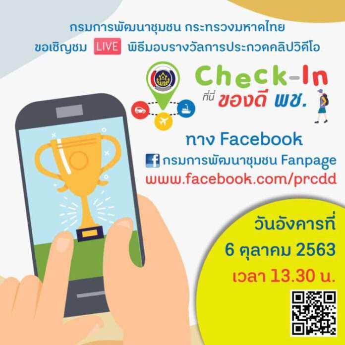 กรมการพัฒนาชุมชน ประกาศผลประกวดคลิป “Check-in ที่นี่ของดี พช.” คัด 34 ผลงานโดดเด่นของนักเรียน นักศึกษา ประชาชน และบุคลากร พช. มีไอเดียสร้างสรรค์นำเสนอเรื่องราวสุดประทับใจ พร้อมเตรียมมอบรางวัล 6 ต.ค. 63 นี้